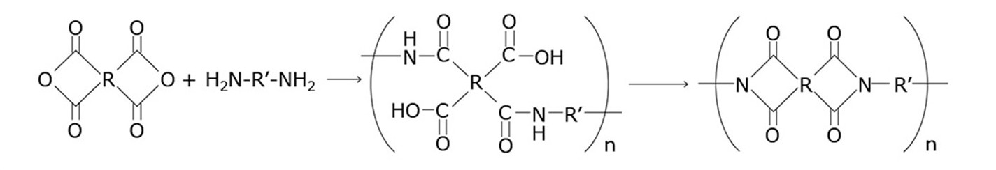 This method is also used in the production of representative polyimide films, such as Kapton®.Figure 2. Two-Step Synthesis of Polyimide (via Polyamic Acid)